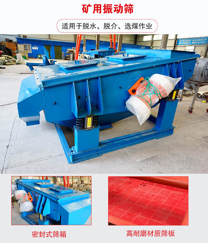 礦用振動篩采用振動電機做激振源、橡膠彈簧裝置支撐并隔振、高耐磨材質(zhì)篩板、密封式篩箱等