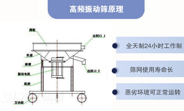 高頻振動篩又稱高頻過濾篩,結(jié)構(gòu)簡單、體積小、具有高頻率,低耗能的特點(diǎn),頻率每分鐘可達(dá)3000次,比相同機(jī)型的篩分過濾設(shè)備耗能減少一半,與物料接觸部分皆可采用不銹鋼304或者316L材質(zhì)。