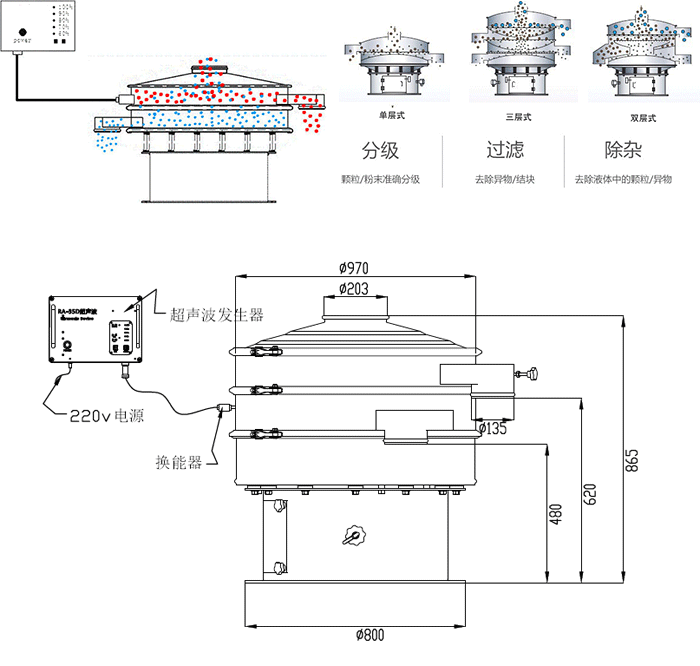 超聲波振動篩是在原有的電機(jī)帶動振動篩振動的基礎(chǔ)上,增加了超聲波系統(tǒng)。振動篩堵網(wǎng)的問題是制約篩分效率的關(guān)鍵,堵網(wǎng)問題解決了,其他問題就迎刃而解.超聲波裝置是由超聲波電源通過換能器將超聲波轉(zhuǎn)換為每秒37000次的高頻機(jī)械波作用于篩網(wǎng)表面。來起到清理篩網(wǎng)的作用。解決了由于篩孔上的靜電附著力,粉末的凝聚作用和插入粗糙網(wǎng)絲表面的微粒而造成的堵塞問題。提高了篩分效率。